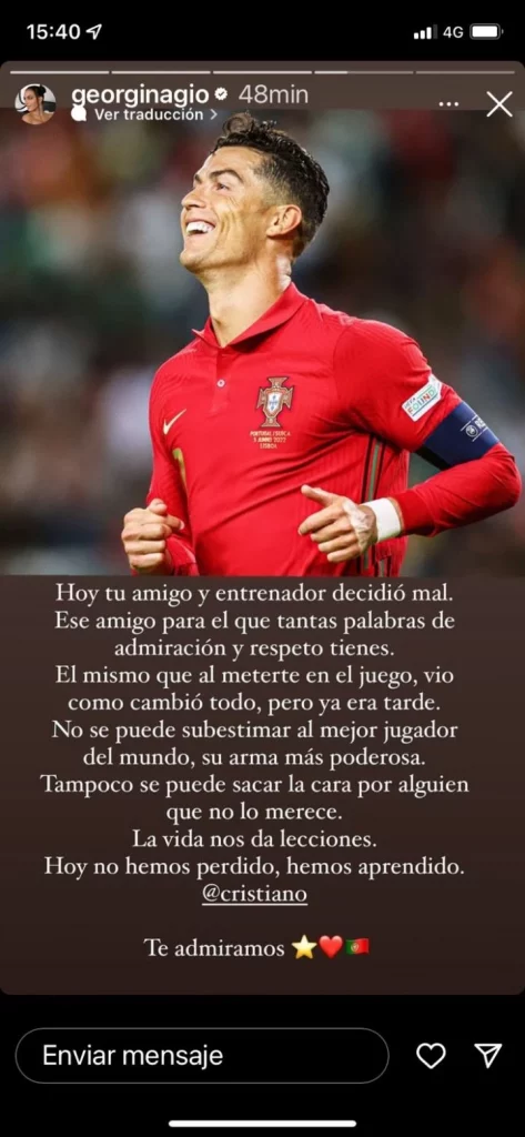 "Hoy tu amigo y entrenador decidió mal. Ese amigo para el que tantas palabras de admiración y respeto tienes. El mismo que al meterte en el juego, vio cómo cambió todo, pero ya era tarde. No se puede subestimar al mejor jugador del mundo, tu arma más poderosa. Tampoco se puede sacar la cara por alguien que no lo merece. La vida nos da lecciones. Hoy no hemos perdido, hemos aprendido. @Cristiano. Te admiramos", dijo ante sus millones de seguidores.