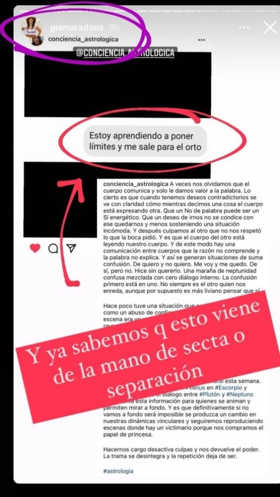 “Gianinna empezó a subir historias con frases y ya sabemos que esto viene de la mano de secta o de separación”, lanzó la periodista. Una de las publicaciones que realizó la hija de diez decía: “Estoy aprendiendo a poner límites y me sale como el orto”. Rápidamente la panelista de Bendita comenzó a capturar la evidencia y mostró todo en sus redes sociales.