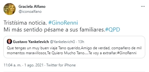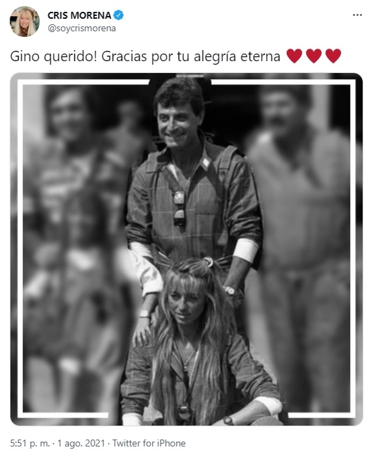 Por su parte, la actriz compartió una imagen del artista y manifestó junto a un corazón blanco: "Buen viaje querido Gino". También, Susana Giménez y Cris Morena se mostraron tristes por el fallecimiento de Renni.