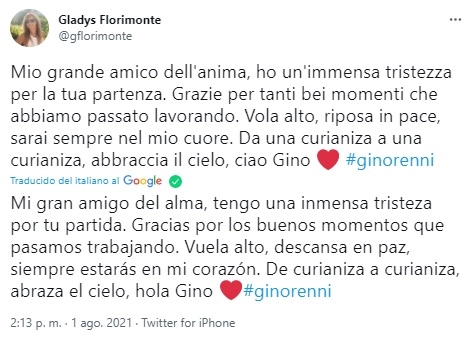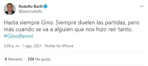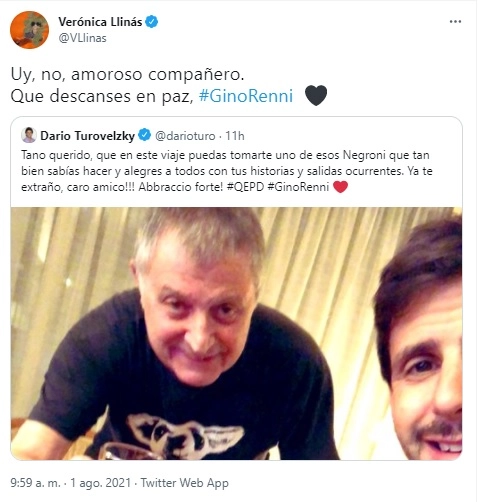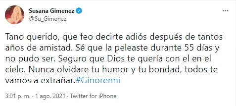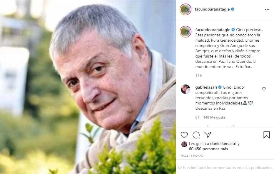 "Tano querido, qué feo decirte adiós después de tantos años de amistad. Sé que la peleaste durante 55 días y no pudo ser. Seguro que Dios te quería con él en el cielo. Nunca olvidaré tu humor y tu bondad, todos te vamos a extrañar", escribió la conductora. Mientras que la productora expresó: "Gino querido, gracias por tu alegría eterna".