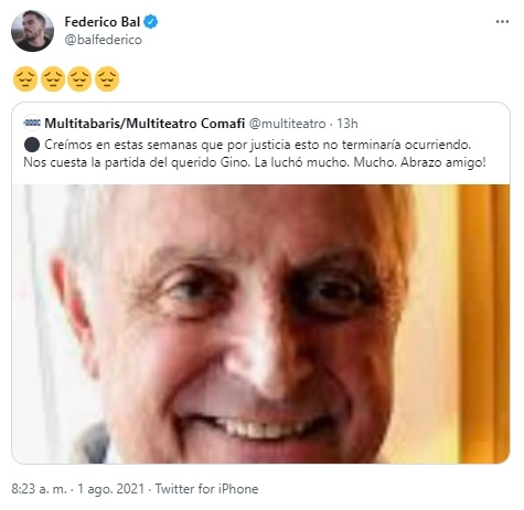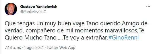 Uno de los primeros fue su gran amigo Gustavo Yankelevich, que a través de su cuenta de Twitter, expresó destrozado: “Que tengas un muy buen viaje Tano, querido. Amigo de verdad, compañero de mil momentos maravillosos. Te quiero mucho, Tano. Te voy a extrañar”.