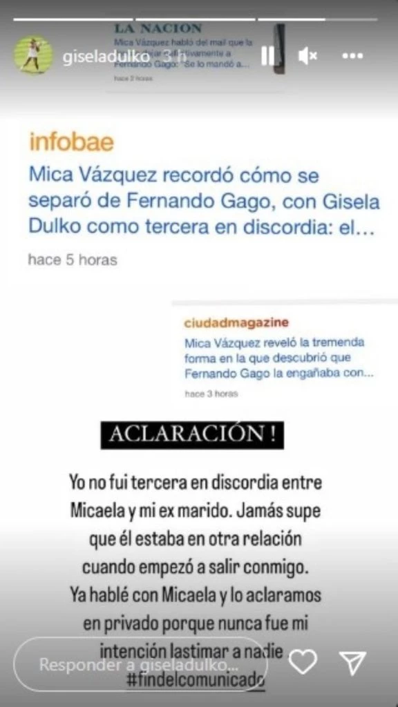 Ahora, ante esas polémicas declaraciones, Gisela Dulko, quien hace poco se divorció de Gago por una infidelidad, utilizó su cuenta de Instagram para defenderse. "Yo no fui la tercera en discordia entre Micaela y mi exmarido. Jamás supe que él estaba en otra relación cuando empezó a salir conmigo. Yo hablé con Micaela y lo aclaramos en privado porque nunca fue mi intención lastimar a nadie. Fin del comunicado", escribió.