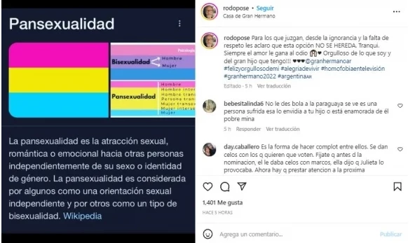 Con esas palabras acompañí con un posteo sobre qué es la pansexualidad. "Es la atracción sexual, romántica o emocional hacia otras persoans independientemente de su sexo o identidad de género", explicó.