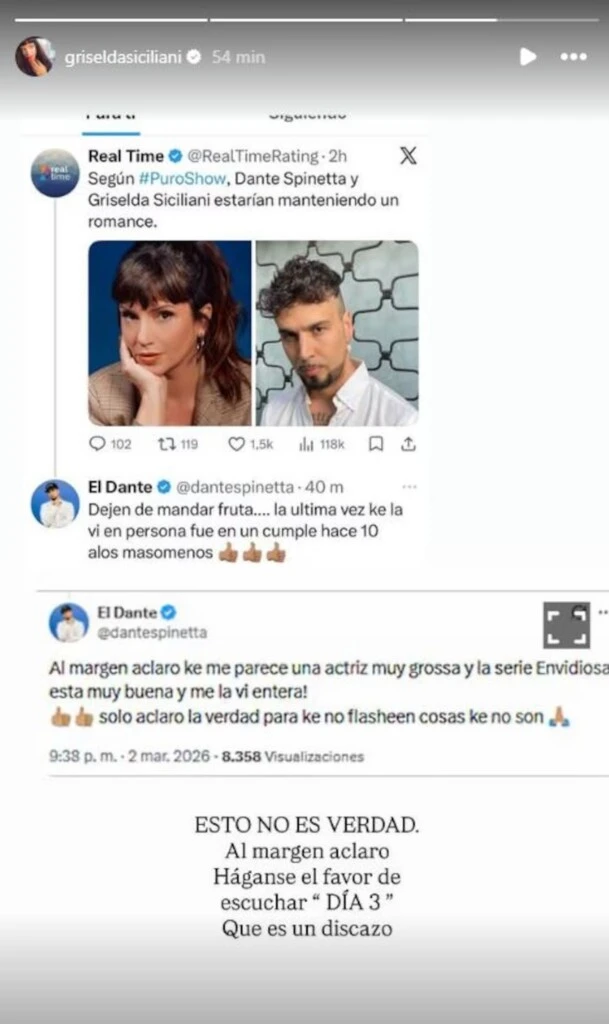 Siciliani retomó las palabras de del músico e hizo una aclaración contundente desde su cuenta de Instagram. Con un mensaje breve, directo y con su sello personal, desmintió cualquier vínculo sentimental. “Esto no es verdad. Al margen, aclaro. Háganse el favor de escuchar ‘Día 3′ que es un discazo”, escribió, en referencia al último trabajo del cantante.