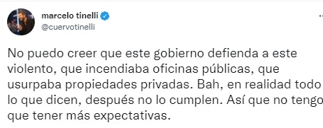 Recientemente, Tinelli lanzó un fuerte tuit contra el Gobierno ya que se mostró furioso al enterarse que el embajador argentino en Chile, Rafael Bielsa, intentó liberar al líder mapuche Jones Huala. "No puedo creer que este gobierno defienda a este violento, que incendiaba oficinas públicas, que usurpaba propiedades privadas. Bah, en realidad todo lo que dicen, después no lo cumplen. Así que no tengo que tener más expectativas", escribió el presentador en su cuenta de Twitter.