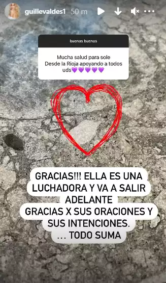 En ese mismo discurso, Marcelo contó que Guillermina visita a Soledad en la clínica y se emociona y llora con ella. Ahora, Valdés compartió a través de sus Stories un mensaje para Aquino: "Ella es una luchadora y va a salir adelante. Gracias por sus oraciones y sus intenciones. Todo suma", escribió.