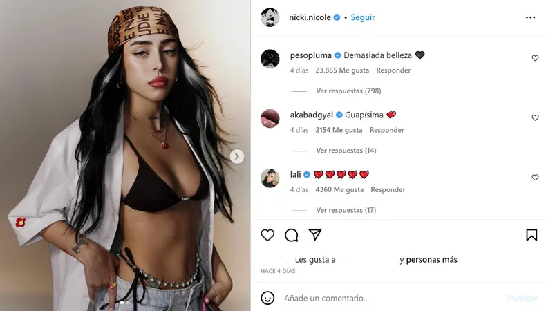 Peso Pluma comentó los últimos tres posteos de Nicki Nicole en Instagram. En una publicación donde ella se muestra con una camisa blanca, una microbikini negra y una bandana de color dorado, Hassan Emilio Kabande Laija le escribió: “Demasiada belleza”. Además, agregó el emoji de un corazón.