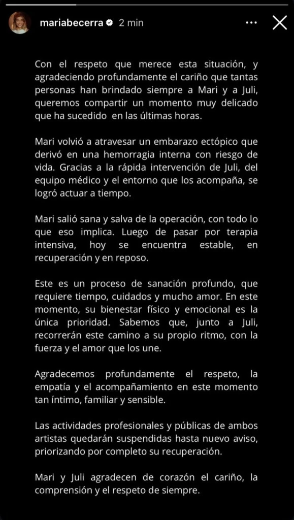 Para finalizar, expresaron: "Agradecemos profundamente el respeto, la empatía y el acompañamiento en este momento tan íntimo, familiar y sensible. Las actividades profesionales y públicas de ambos artistas quedarán suspendidas hasta nuevo aviso, priorizando por completo su recuperación".