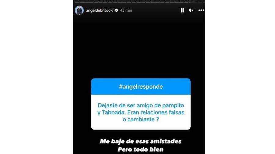 "Dejaste de ser amigo de Pampito y Taboada. ¿Eran relaciones falsas o cambiaste?", le preguntaron. De inmediato, sin agregar una foto como fondo, Ángel de Brito contestó: "Me bajé de esas amistades. Pero todo bien".