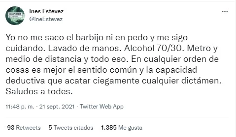 A su tuit, agregó acerca de la decisión de las autoridades: "En cualquier orden de cosas es mejor el sentido común y la capacidad deductiva que acatar ciegamente cualquier dictamen. Saludos a todes"