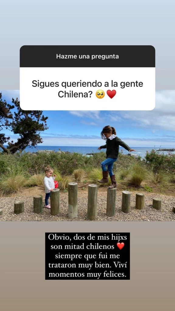 "Obvio, dos de mis hijos son mitad chilenos", comenzó diciendo María Eugenia Suárez, en una historia de Instagram en la que compartió una foto de Magnolia y Rufina con un hermoso paisaje en las playas de Chile. Y continuó, "Siempre que fui me trataron muy bien. Viví momentos muy felices".