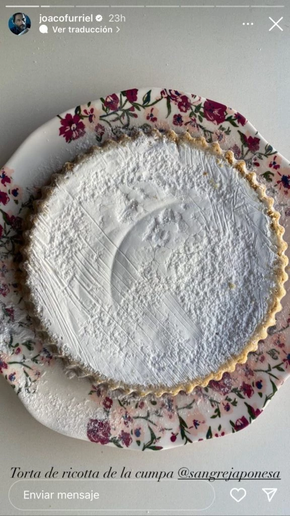 Acto seguido, se filmó degustando el postre y dando su visto bueno a las cualidades culinarias de la actual novia de Rusherking. "Torta de ricota de la cumpa", escribió junto a una imagen del pastel, arrobando a la China Suárez.