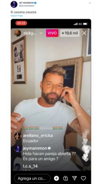 “Hola, ¿hacen pareja abierta? Es para un amigo”, indagó Mammon, quien le planteó la posibilidad de sumarse al matrimonio del cantante con el artista plástico Jwan Yosef. Si bien no recibió respuesta de Ricky, Jey capturó el momento en el que su consulta salió entre los miles de comentarios que recibió el artista y la publicó en su cuenta de Twitter. “Si pasaba, pasaba”, escribió pícaro.