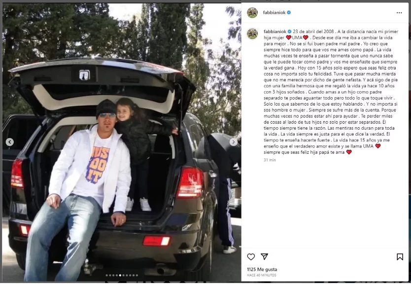 “Hoy con 15 años solo espero que seas feliz. No importa otra cosa, solo tu felicidad”, le deseó su padre y agregó un 'curioso' pasaje: “Tuve que pasar mucha mierda que no me merecía por dichos de gente nefasta. Y acá sigo de pie con una familia hermosa que me regaló la vida ya hace 10 años, con 3 hijos soñados”.