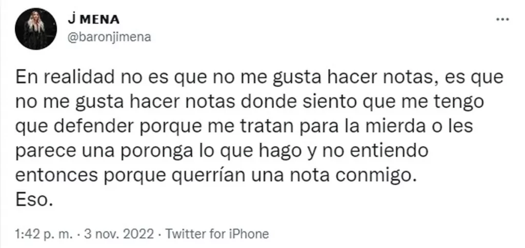 Por ese motivo, en su perfil de Twitter, Jimena Barón escribió un descargo para aclarar su enojo: "En realidad no es que no me gusta hacer notas, es que no me gusta hacer notas donde siento que me tengo que defender porque me tratan para la mierda o les parece una poronga lo que hago y no entiendo entonces porque querrían una nota conmigo. Eso", cerró La Cobra