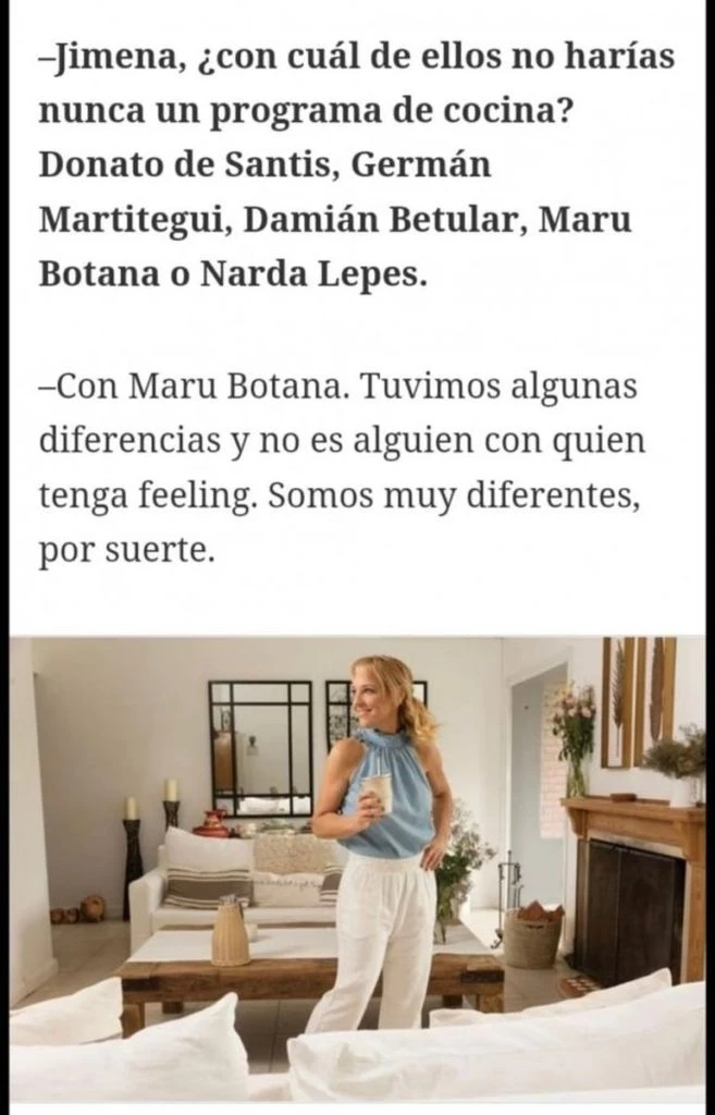 Además, la especialista en cocina explicó el motivo por el cual no trabajaría con Botana: “Tuvimos algunas diferencias y no es alguien con quien tenga feeling. Somos muy diferentes, por suerte”.