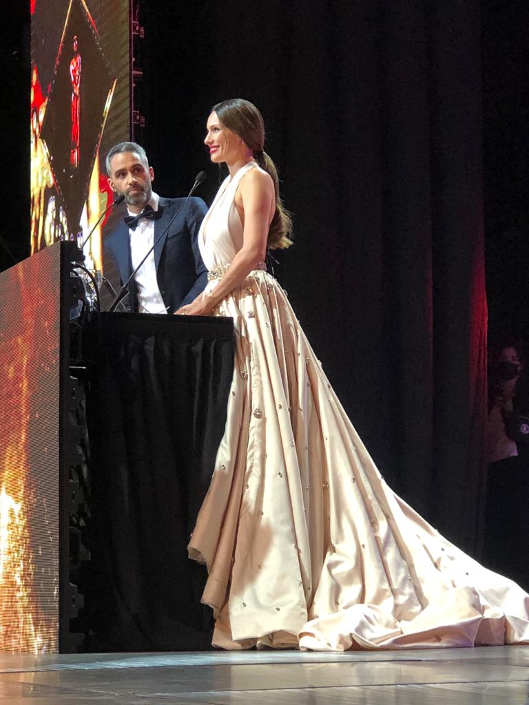Acompañada por un séquito de 13 personas, la modelo y jurado de La Academia (eltrece) que ganó una estatuilla por su programa Pampita Online, lució en el Luna Park una tríada de diseños exclusivos a cargo de los más destacados creadores de la moda de Argentina que, por supuesto, son sus favoritos. Uno de ellos, elegido para su tercer y último cambio, fue el del diseñador Jorge Rey.