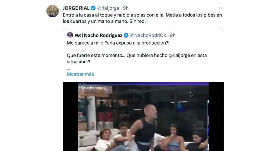 El comentario del periodista surgió porque un usuario de la mencionada red social le preguntó qué hubiera hecho después de que la jugadora exponga a la producción. Según Juliana Furia Scaglione, estaba cansada de que la censuraran. Después, tuvo un intenso frente a frente con Federico Farías y se declararon la "guerra". Entonces, el periodista Nacho Rodríguez le preguntó a Rial qué hubiera hecho él en este caso.