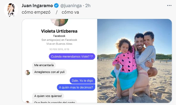 Juan Ingaramo se sumó al desafío viral de las redes sociales donde muestran cómo empezó y cómo va su pareja. El posteo lo realizó por medio de su cuenta oficial de Twitter y reveló cómo fue el inicio de la relación con Violeta Urtizberea.