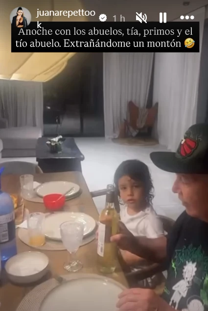 Mientras Juana transitaba el nacimiento de Timoteo, sus hijos Toro y Belisario quedaron al cuidado de la familia, en un clima de cercanía y afecto. En otra de las historias que compartió, mostró una escena íntima de la noche familiar: los niños cenando junto a sus abuelos, una tía, primos y un tío abuelo.