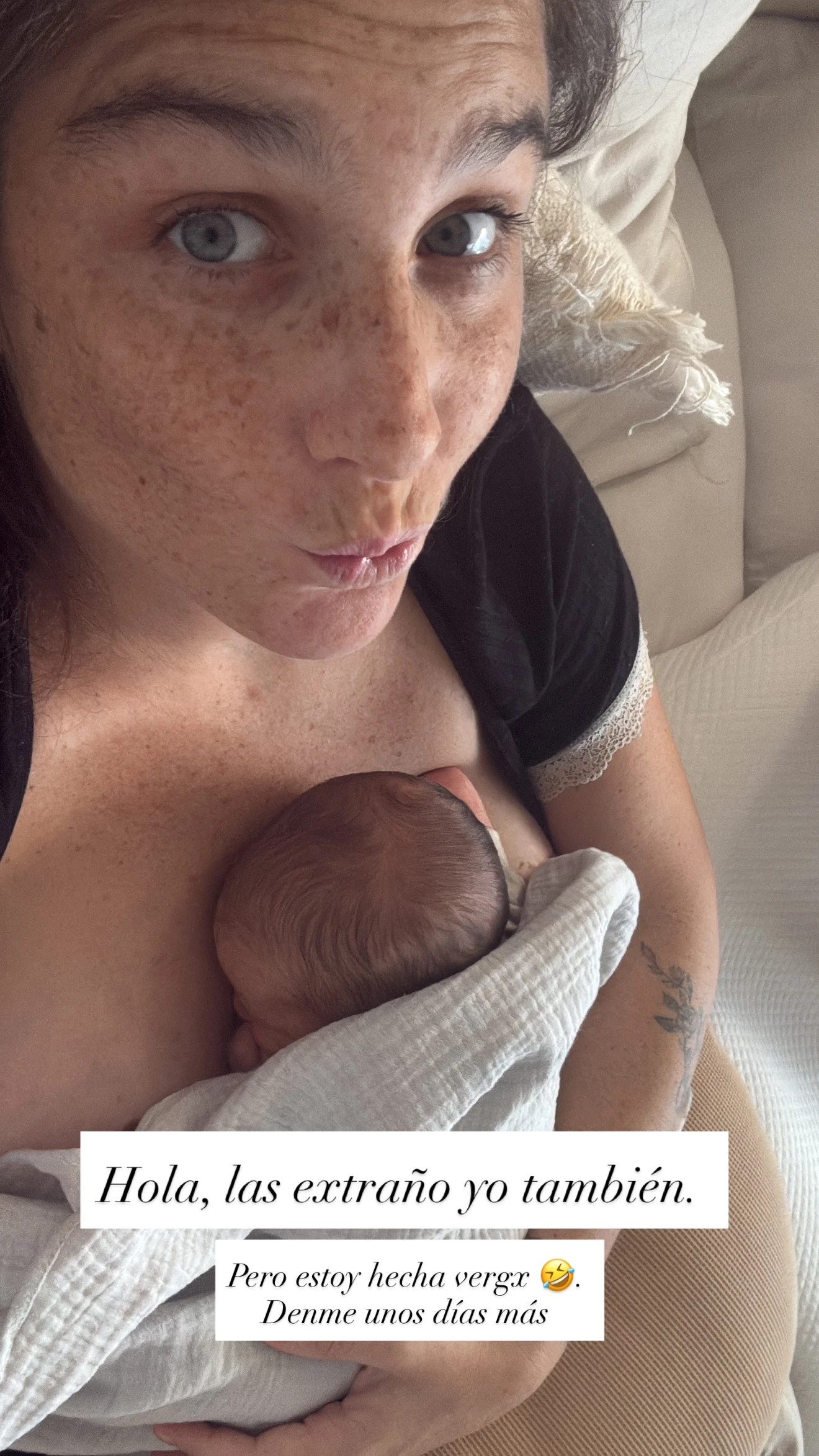 La escena que compartió la actriz en sus historias de Instagram derriba cualquier intento de pose o glamour: se la ve recostada en un sillón, mirando a cámara con un gesto simpático y mostrando a Timoteo en brazos, amamantándolo mientras lo cobija con una manta. Sobre la imagen, escribió: “Hola, las extraño yo también… Pero estoy hecha vergx. Denme unos días más”. Con ese mensaje lleno de humor y franqueza, la actriz dejó saber que extraña la interacción con sus seguidores pero que necesita espacio para reorganizarse en esta etapa tan intensa.