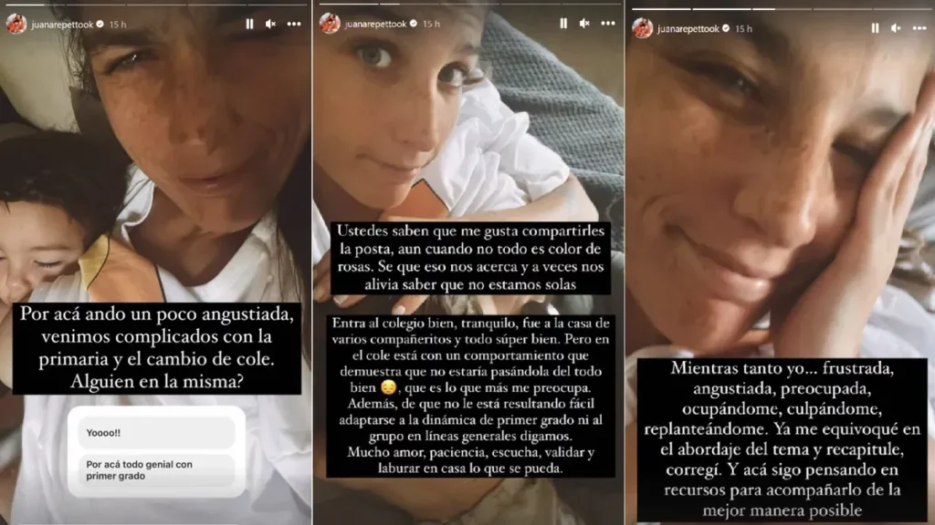 La artista remarcó que no está pasando un buen momento y que está muy preocupada por la adaptación de su hijo en la escuela primaria. A través de las stories de Instagram, Juana le pidió consejos a los miles de seguidores que forman una comunidad.