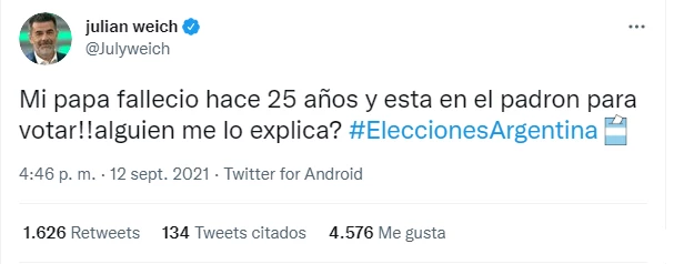 Según informó el conductor, su papá figura en el padrón electoral a pesar de haber muerto hace 25 años. El tuit de Weich se viralizó y muchos usuarios le contestaron que pasaron por situaciones similares y le recomendaron hacer la denuncia formal.