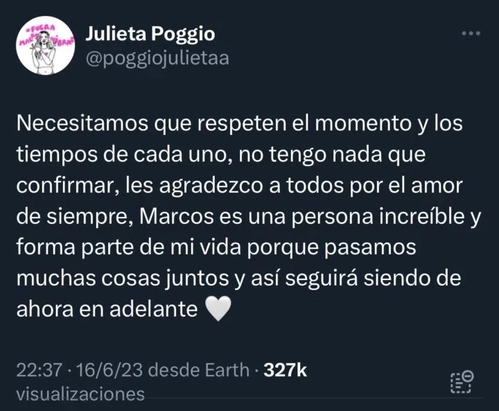 La exhermanita habló de su vínculo con Marcos Ginocchio luego de que Yanina Latorre asegurara que ambos mantienen una relación sentimental fogosa y oculta. "Necesitamos que respeten el momento y los tiempos de cada uno. No tengo nada que confirmar. Les agradezco a todos por el amor de siempre. Marcos es una persona increíble y forma parte de mi vida porque pasamos muchas cosas juntos y así seguirá siendo de ahora en adelante", Aseguró Julieta Poggio a través de sus redes sociales. Y su respuesta fue interpretada como "ambigua" por parte de los usuarios que ya gritan a los cuatro vientos que "Marculi es real".