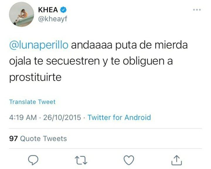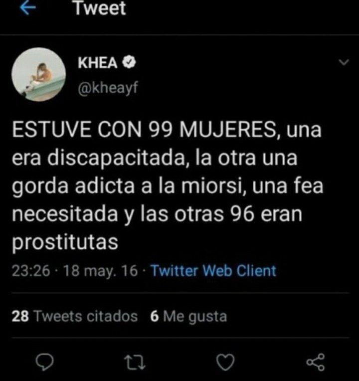 En los tuits, Khea lanzaba comentarios discriminatorios contra la comunidad homosexual, como "Soy hermoso y entiendo que me quieran caer hasta los hombres, pero te juro que detesto a los gays" o "Qué asco los gays".