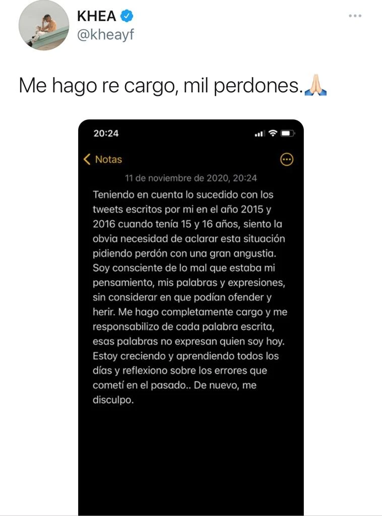Mientras se iban viralizando esos mensajes, publicados cuando tenía 14 años, el músico –a quien se llegó a relacionar sentimentalmente con Tini– comenzó a borrarlos. Tras su "cancelación" en Twitter, muchos compararon su caso con el del youtuber Martín Cirio, La Faraona, quien fuera reprobado por sus viejos tuits de tenor pedófilo. Del mismo modo, el trapero eligió emitir un comunicado con el siguiente título: "Me hago re cargo, mil perdones".