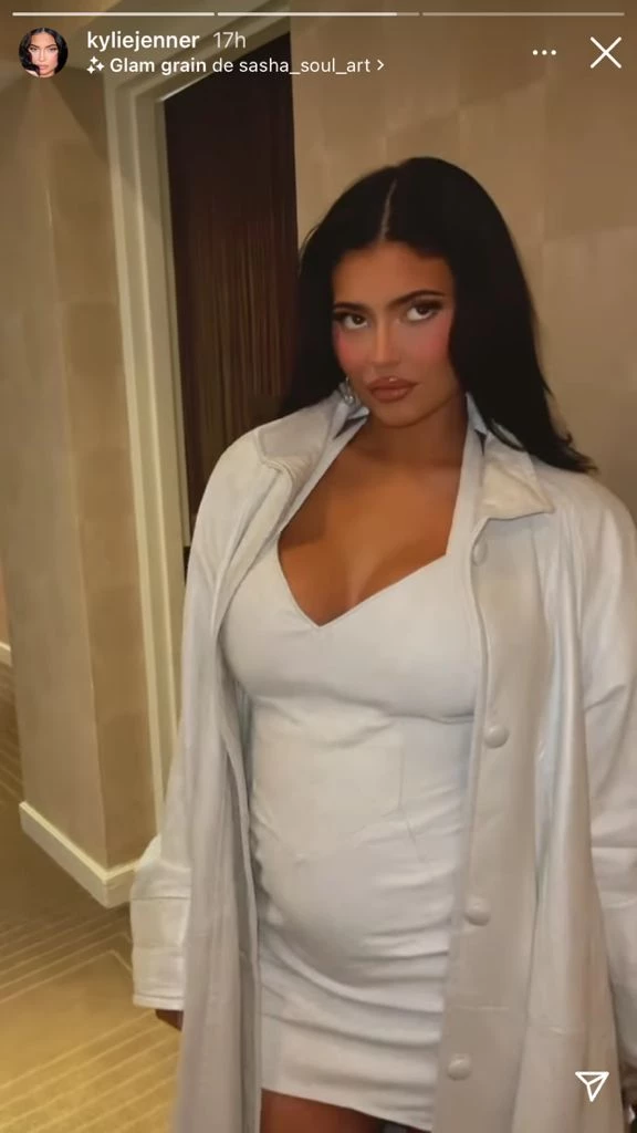 A un día de anunciar que está embarazada, compartió un despampanante primer look. En total white, Kylie lució un ajustado, corto y escotado vestido que realzaba su incipiente vientre. Para complementar su estilismo, optó por un trench largo y peep toes con vinilo transparente.