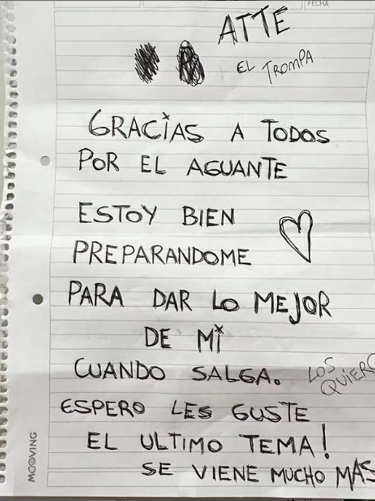 Desde la cárcel, L-Gante escribió una carta que compartió en las redes sociales y que decía: "Gracias a todos por el aguante. Estoy bien preparándome para dar lo mejor de mí para cuando salga. Espero les guste el último tema! Se viene mucho más". Luego, firmó como "El Trompa" y dijo que quería a todos.