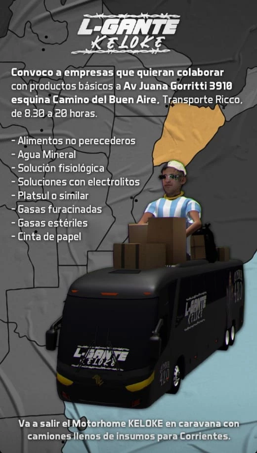 Y con el dibujo de L-Gante subido a un micro con muchas cajas el panfleto aclaraba, “Va salir el Motorhome Keloke en caravana con camiones llenos de insumos para Corrientes”.