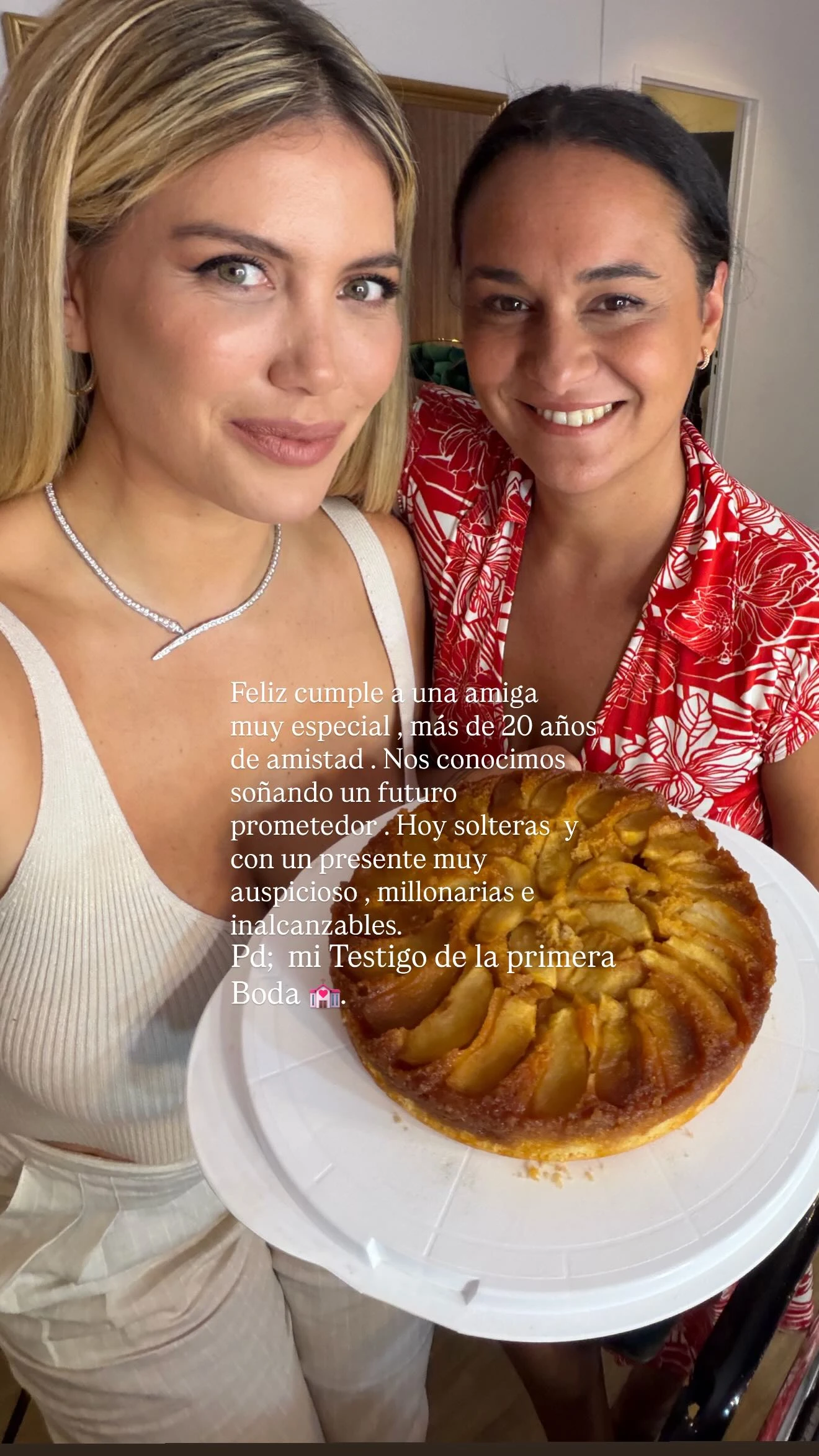 Wanda Nara compartió este miércoles en Instagram una imagen celebrando el cumpleaños de una amiga muy especial. En la foto se observa una torta casera sobre un plato blanco y un texto que rápidamente se convirtió en tema de conversación: “Feliz cumple a una amiga muy especial, más de 20 años de amistad. Nos conocimos soñando un futuro prometedor. Hoy solteras y con un presente muy auspicioso, millonarias e inalcanzables. Pd: mi testigo de la primera boda”.
