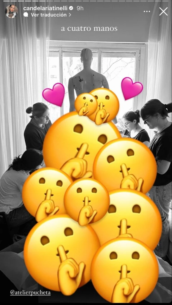 "A cuatro manos", escribió la futura esposa junto a una fotografía del maniquí junto a las costureras que están realizando la pieza que usará en tan solo 7 días.