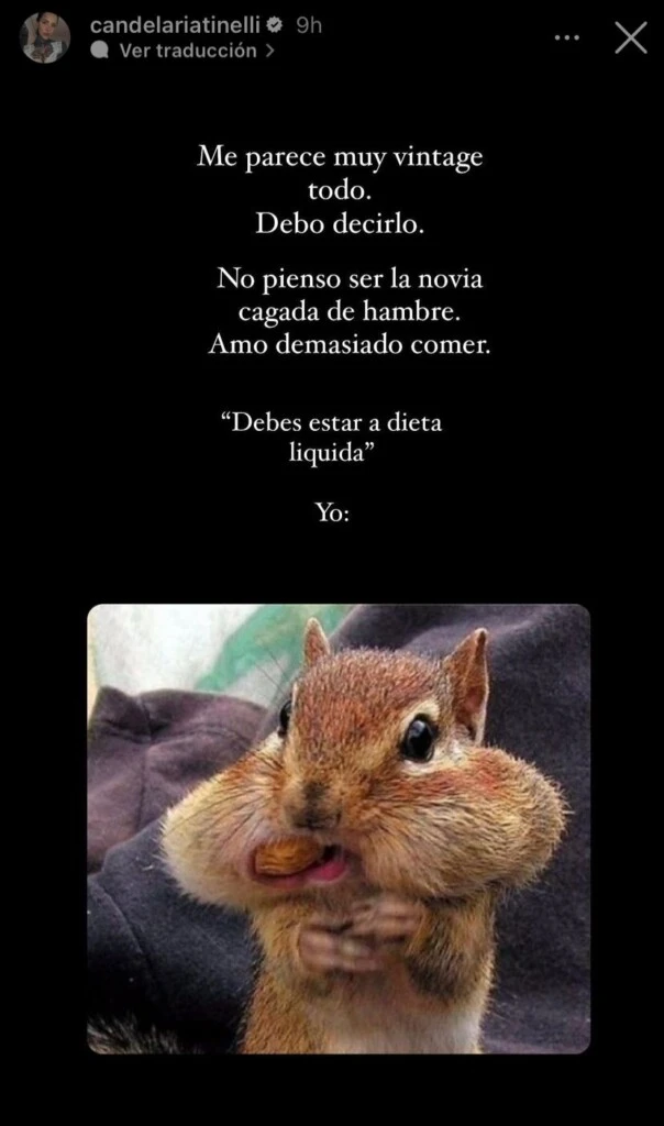 Sobre este asunto aseguró: "Me parece muy vintage todo. No pienso ser la novia que se caga de hambre. Amo demasiado comer".