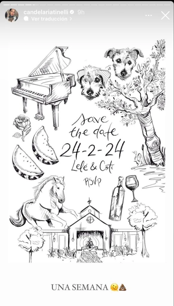 En la imagen se puede ver un diseño, que pareciera o simula ser hecho a mano. "Reservá la fecha, 24-2-2024, Lelé y Coti", lleva inscripto.