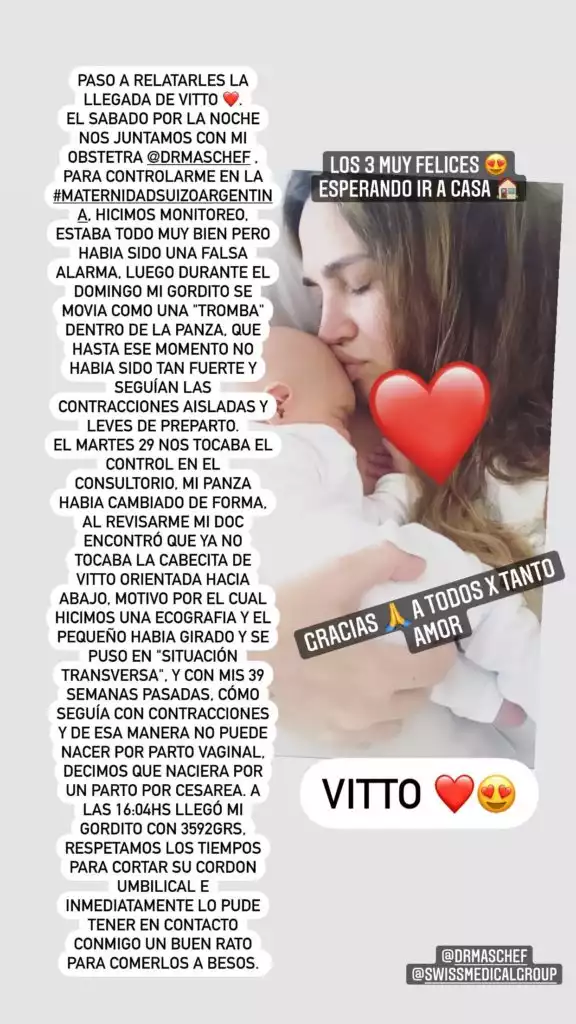 Y siguió: "El martes 29 nos tocaba el control en el consultorio. Mi panza había cambiado de forma... Al revisarme, mi doctora encontró que ya no tocaba la cabecita de Vitto orientada hacia abajo. Hicimos una ecografía y nos dimos cuenta de que el pequeño había girado. Se había puesto en situación transversa. Y con mis 39 semanas de embarazo pasadas como seguía con contracciones no pudo nacer por parto vaginal".