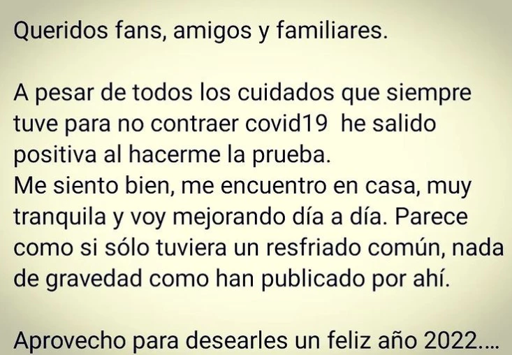 "Me siento bien, me encuentro en casa, muy tranquila y mejorando día a día. Parece como si solo tuviera un resfriado común, nada de gravedad como han publicado por ahí", continuó el comunicado.