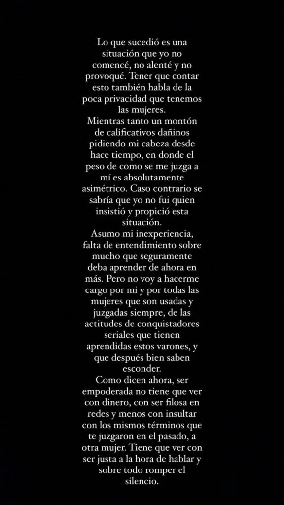 “Lo que está sucediendo hoy tiene detrás una historia mucho más grande y profunda de la que seguramente muchas mujeres van a sentirse identificadas. Me ha tocado relacionarme con hombres a los que les he creído siempre sus palabras: que estaban separados o separándose y que no había conflicto. Siento en esta situación un deja vu infernal donde vuelvo a pagar con mi reputación cuestiones que son del dominio personal de cualquier mujer".