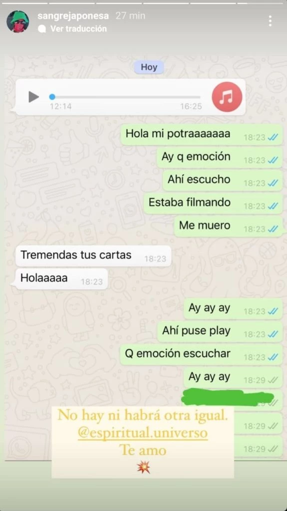En la foto puede verse un extenso audio que le envío la tarotista a la actriz contándole lo que ve en las cartas sobre su vida: “Tremendas tus cartas” le dice la especialista. Inmediatamente la actriz le contestó eufórica: “Ay qué emoción”.