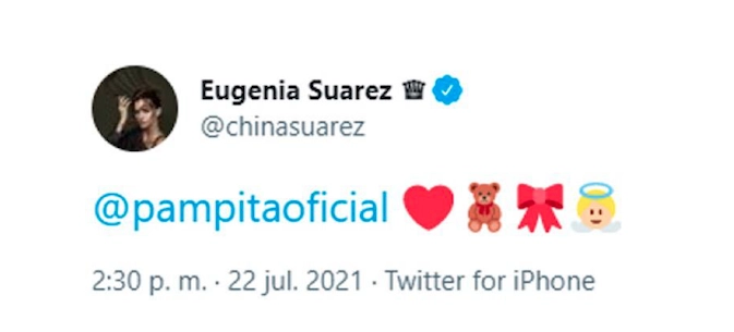 Ahora la actriz tomó su cuenta de Twitter para expresarle a Pampita sus felicitaciones públicas. Eugenia arrobó a la conductora de Pampita Online y jurado de La Academia (eltrece) y le escribió cuatro emojis con los que compartió su felicidad por la llegada de la nueva bebé de la familia.