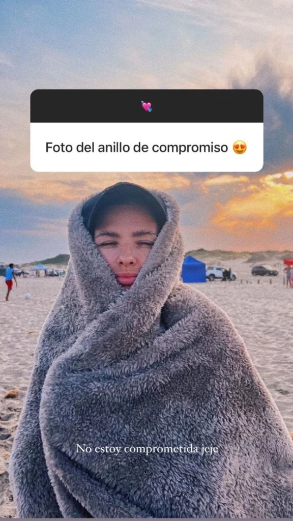 Con una foto de ella en la playa, envuelta en una frazada, afirmó: “No estoy comprometida jeje”. Los rumores de compromiso comenzaron en diciembre cuando Eugenia Suárez mostró en un posteo los regalos que le hizo su novio durante Año Nuevo, mientras se encontraban disfrutando en Playa del Carmen, México.