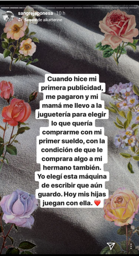 “Cuando hice mi primera publicidad, me pagaron y mi mamá me llevó a la juguetería para elegir lo que quería comprarme con mi primer sueldo, con la condición de que le comprara algo a mi hermano también. Yo elegí esta máquina de escribir que aún guardo. Hoy mis hijas juegan con ella” escribió la China y posteó una foto de su juguete en impecable estado.