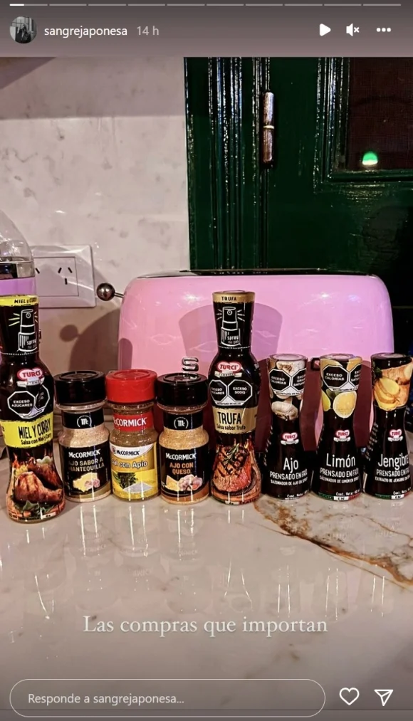 "Las compras que importa", comenzó diciendo cómplice con sus fans la modelo para luego mostrar todos los nuevos articulos que sumó a su alacena. Ajo, limón y jengibre prensado en frío, sal con apio y polvo de miel y curry son sólo algunos de los condimentos que eligió para traerse a Buenos Aires.