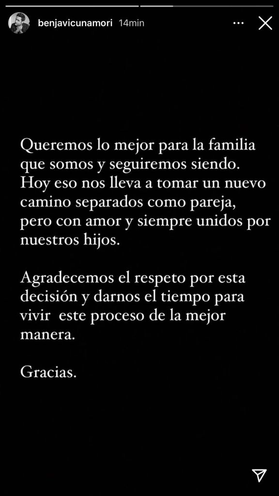 En un breve comunicado compartido en sus Instagram stories, Vicuña escribió: "Queremos lo mejor para la familia que somos y seguiremos siendo. Hoy eso nos lleva a tomar un nuevo camino separados como pareja, pero con amor y siempre unidos por nuestros hijos". Y finalizó su escrito con el siguiente pedido: "Agradecemos el respeto por esta decisión y darnos el tiempo para vivir este proceso de la mejor manera. Gracias".