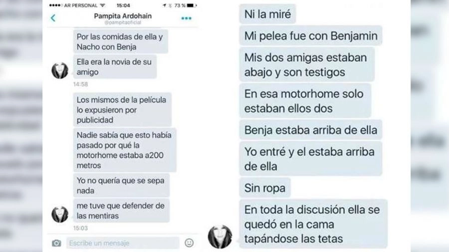 Mientras Eugenia y Benjamín negaban su vínculo, Pampita continuó dando más detalles del momento en el que encontró infraganti a su pareja y padre de sus hijos Benicio, Beltrán y Bautista: “Ni la miré (a la China Suárez), mi pelea fue con Benjamín, mis dos amigas estaban abajo y son testigos. En esa motorhome solo estaban ellos dos, Benja estaba arriba de ella, yo entré y él estaba arriba de ella, sin ropa. En toda la discusión ella se quedó en la cama tapándose las tetas”.