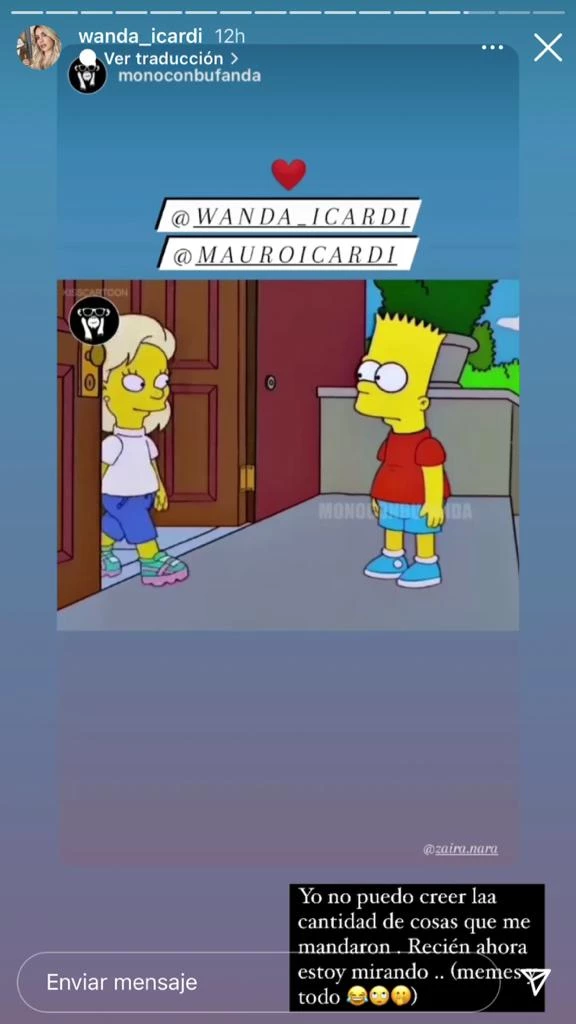 "Yo no puedo creer la cantidad de cosas que me mandaron. Recién ahora estoy mirando. Memes y todo", escribió jocosa al compartir unos naif memes de Los Simpsons publicados por el usuario @monoconbufanda.