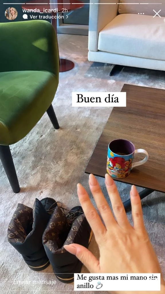 "Buen día. Me gusta más mi mano sin anillo", escribió Wanda junto a una postal en la que muestra en primer plano su mano sin la alianza de casamiento y en la que se ve una taza de café de Alicia en el país de las maravillas y un cómodo calzado firmado por Louis Vuitton.