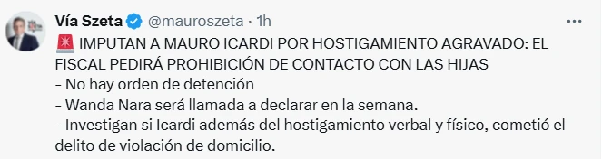 Por su parte, Mauro Szeta confirmó en sus redes sociales la imputación a Mauro Icardi por hostigamiento agravado. "El fiscal pedirá prohibición de contacto con las hijas", remarcó el periodista. Y especificó: "Investigan si Icardi además del hostigamiento verbal y físico, cometió el delito de violación de domicilio. No hay orden de detención. Wanda Nara será llamada a declarar en la semana".